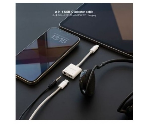 - 1 x Adaptador de Audio USB-C/M a Jack 3.5/H + USB-C/H PD 60W, 11.5 cm, Blanco