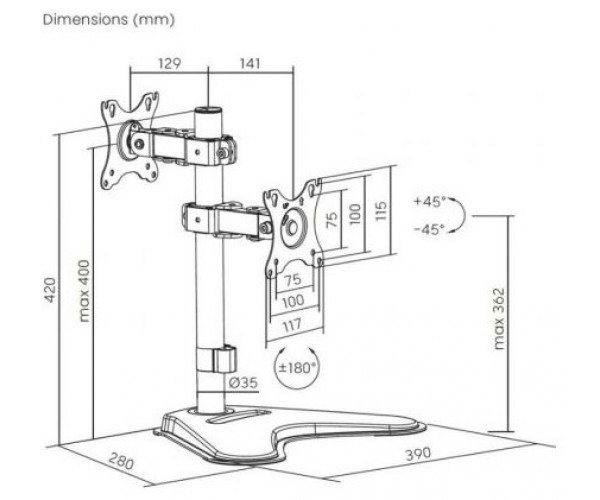 • Tipo: Soporte de mesa inclinable y rotable para 2 monitores/POS (1 pivote, 2 brazos) de 17”-32”