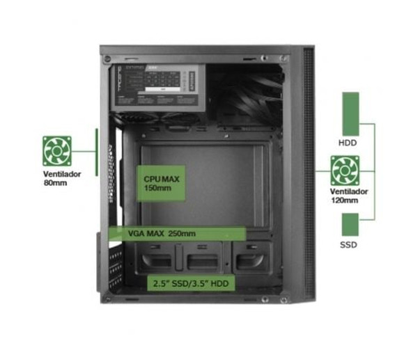 Características:. . Diseño. Caja de ordenador compacta Micro-ATX / Mini-ITX de alto rendimiento diseñada para ofrecer una estética minimalista y elegante, con una gran funcionalidad y una refrigeración sobresaliente. Cuenta con un frontal de con una malla completa de refrigeración y un acabado negro profesional que encaja perfectamente en contextos tanto domésticos como de oficina.. . Prestaciones. Dispone de una estructura totalmente optimizada y actualizada a las últimas tendencias para un montaje fácil y accesible ofreciendo, además, una total conectividad para tus periféricos. Dispone de multiples bahías internas para diferentes combinaciones de discos duros (2 x 2.5" SSD o 2 x 3.5" HDD).. . Conectividad. Cuenta con puerto USB 3.0, USB 2.0, micrófono y audio HD en el panel frontal que te permiten conectar tus periféricos con total comodidad.. . Refrigeración. Aparte de su rejilla frontal completa, cuenta con un amplio soporte para ventilación, permitiéndote instalar un ventilador frontal y otro lateral de 12cm, además de uno de 8 cm en la parte trasera.. . Fuente de alimentación de 500W. . Incluye una fuente de alimentación de última generación SMD de 500W equipada con un ventilador de 12cm ultrasilencioso de 14dB, con un sistema antivibraciones. Completamente negra y con cables negros para mantener una estética perfecta. Además, cuenta con una eficiencia energética estable del 85% y todas las protecciones de seguridad y las certificaciones europeas, garantizando el mejor rendimiento y estabilidad para tu PC.. Especificaciones:. Tipo: Caja Mini Torre. Placas: MicroATX / Mini-ITX. Estructura: Optimizada con múltiples bahías para un montaje fácil y accesible. Conectividad: USB3.0 x1 / USB2.0 x2 / HD Audio + Mic. Bahías: 2x 3.5"" HDD / 2x 2.5"" SSD. Ventilación: 1x 120mm frontal, 1x 120mm lateral, 1x trasero 80mm. Ranuras de expansión: 4. VGA: 250mm. CPU: 145mm. Fuente de alimentación: 500W ATX con ventilador de 12cm. Conectores: 1xATX 20+4pin/ 1x EPS 4+4pin/2x SATA/2x PATA. Dimensiones: 291x188x345