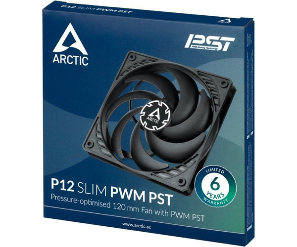 Con un amplio rango de velocidad y la innovadora tecnología PWM Sharing (PST), la velocidad del ventilador del P12 Slim PWM PST se puede controlar en sincronía con la de otros ventiladores. Los ventiladores PST de ARCTIC incorporan su propia solución de conexión en cadena y, además del conector, cuentan con otra toma para conectar uno o hasta cuatro ventiladores PST en serie.