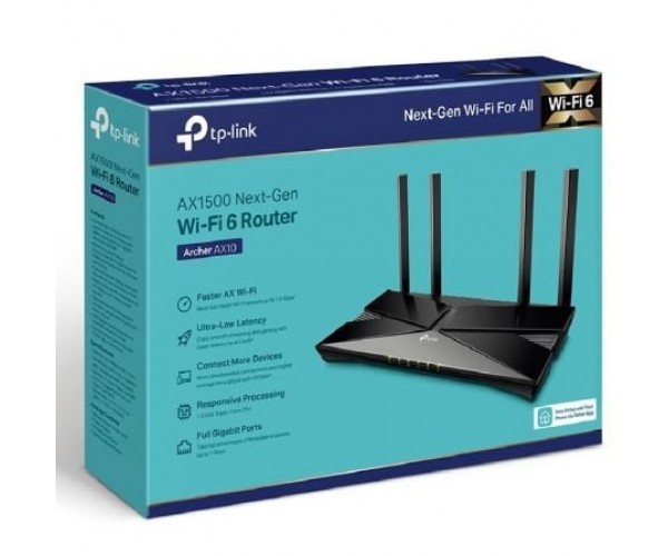 TP-LINK Archer AX10. Tipo de conexión WAN: RJ-45. Banda Wi-Fi: Doble banda (2,4 GHz / 5 GHz), Estándar Wi-Fi: Wi-Fi 6 (802.11ax), Tasa de transferencia de datos WLAN (máx.): 1500 Mbit/s. Tipo de interfaz Ethernet LAN: Gigabit Ethernet, Estándares de red: IEEE 802.11a,IEEE 802.11ac,IEEE 802.11ax,IEEE 802.11b,IEEE 802.11g,IEEE 802.11n, Ethernet LAN, velocidad de transferencia de datos: 10,100,1000 Mbit/s. Algoritmos de seguridad soportados: 64-bit WEP,128-bit WEP,WPA,WPA-PSK,WPA2,WPA2-PSK, Seguridad con cortafuegos: SPI. Protocolos de red compatibles: IPv4, IPv6