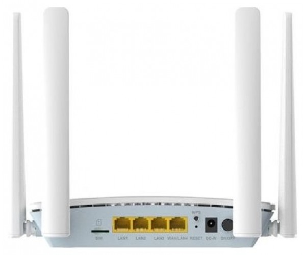 - Interfaces del dispositivo: 3 puertos LAN Fast Ethernet, 1 puerto WAN/LAN Fast Ethernet, botón WPS, botón Reset, botón de encendido, ranura para tarjeta SIM Nano (4FF), conector de alimentación