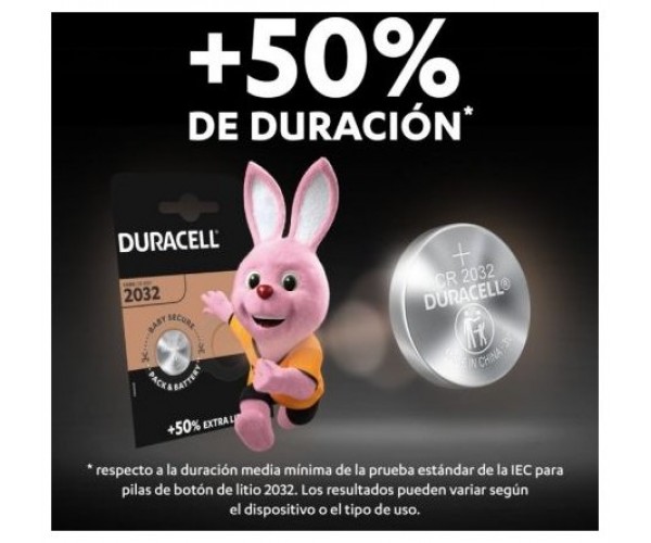 Las pilas especiales Duracell de botón de litio 2032 están fabricadas con litio de alta pureza y ofrecen hasta un 50 % más de potencia (respecto a la duración media mínima de la prueba estándar de potencia de servicio de la IEC para pilas de botón 2032, 2025 y 2016 de litio.