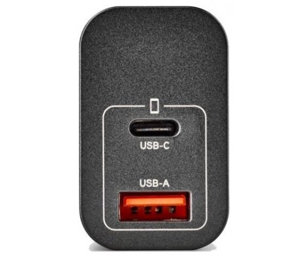 • Cargador GaN de pared con una salida USB-C (PD & PPS) y una salida USB-A QC 3.0 (Quick charge) de hasta 30W de potencia máxima para cargar dispositivos de manera rápida.