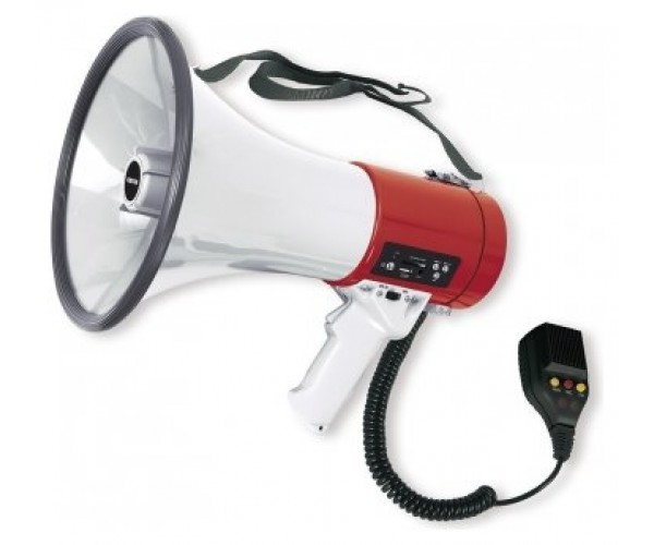 Megáfono portátil de 25 W máximo con sirena, reproductor USB/SD/MP3 y grabador de mensaje de 15 segundos.