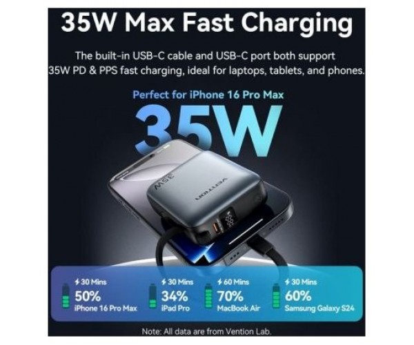 Powerbank 10000mAh Vention FHFH0/ 35W/ Gris/ Incluye Cable USB Tipo-C