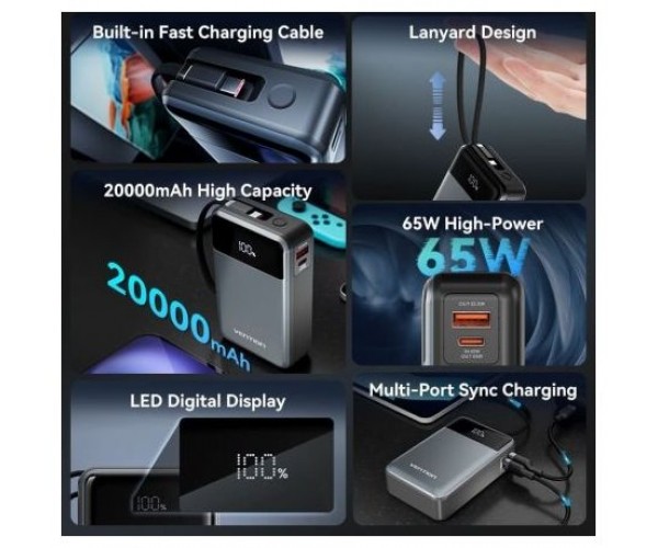 20000mAh Power Bank (USB-C + USB-C/USB-A) with Built-in USB-C Cable 65W Black LED Display Type