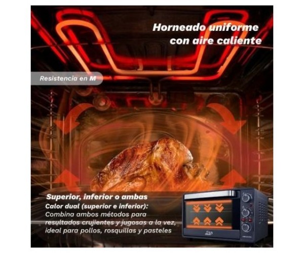 El horno eléctrico de GRUNKEL HR-28COOK es perfecto para quienes buscan rendimiento, versatilidad y eficiencia en su cocina. Con 1600W de potencia y capacidad de 28 litros, permite preparar desde carnes y pescados hasta pasteles. Su resistencia superior en M y el sistema de convección con botón independiente garantizan una cocción más rápida, uniforme y eficiente. Dispone de 3 modos de calor (superior, inferior y combinado), temperatura regulable hasta 230°C y temporizador mecánico de hasta 60 minutos con aviso acústico. Incluye una luz interior activable para vigilar el proceso sin abrir la puerta. El diseño robusto cuenta con tirador de seguridad de tacto frío y acabados en acero inoxidable que aportan durabilidad y estilo. Se entrega con bandeja, parrilla y asa extractora. El horno GRUNKEL HR-28COOK es una solución completa para cocinar como un chef, incluso en espacios compactos.
