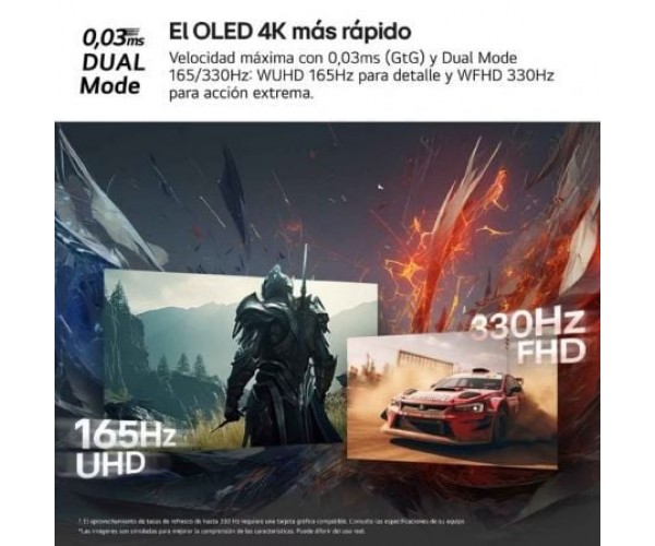 - Descubre la nueva revolución OLED gaming 4K con la máxima velocidad de 0,03ms (GtG) y la innovadora tecnología Dual Mode (165/330 Hz)⁽¹⁾ que se adapta a tu estilo de juego en un solo clic.