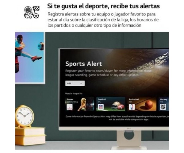 | Característica | - HDR 10 - Modo imagen - Brillo Automático: Auto Brightness - Temporizador - Inicio rápido - Simplink(HDMI CEC) - Modo Tienda - Ahorro de Energía - Flicker safe - Modo Lectura - Ecualizador - Altavoz Bluetooth - Versión webOS: webOS 23 - Inclinación: -5 ~ 15º - Altavoces: 5W x2 Alimentación - Entrada de CA: Entrada de CA - Salida CC: Salida CC - Consumo de energía (CC apagada): 0,5 - Consumo de energía (modo de suspensión): 0,5 - Consumo de energía (típico): 30W - Tipo: Incorporado Dimensiones y peso - Montaje en Pared (VESA): 100 x 100 mm - 731.8 x 521.2 x 209.9 mm - 6,6 kg |