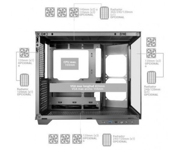 - Capacidad de ventiladores: Hasta 9x 120mm o 6x 120mm + 2x 140mm