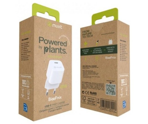 El cargador de pared muvit for change BiooFnix 25W representa una nueva generación de tecnología más respetuosa con el planeta. Fabricado a partir de aceite de ricino transformado en bioresina, este cargador nace literalmente de una semilla, como símbolo de innovación sostenible y compromiso medioambiental.