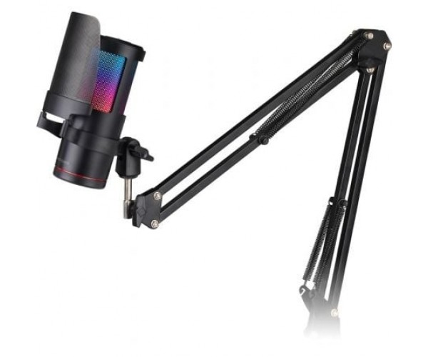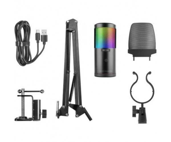 Diagrama polar. Cardioid. SPL. 120dB. Sensibilidad. -45dB±3dB. Rango de frecuencias. 20Hz-20kHz. SNR. 85dB. Corriente. 120mA. Voltaje de entrada. 5V. Conectores. USB (Micrófono) / Jack 3.5mm (Auriculares). Material. ABS. Peso. 332g (soporte) / 130g (micrófono). Longitud del cable. 1.7m. Iluminación. ARGB Flow. Impedancia. <2.2kΩ. Compatibilidad. Windows, Mac, Switch, PS4, PS5. Dimensiones. 141x52x80mm (microphone) / 740mm (arm)