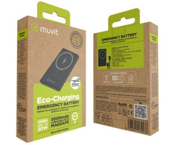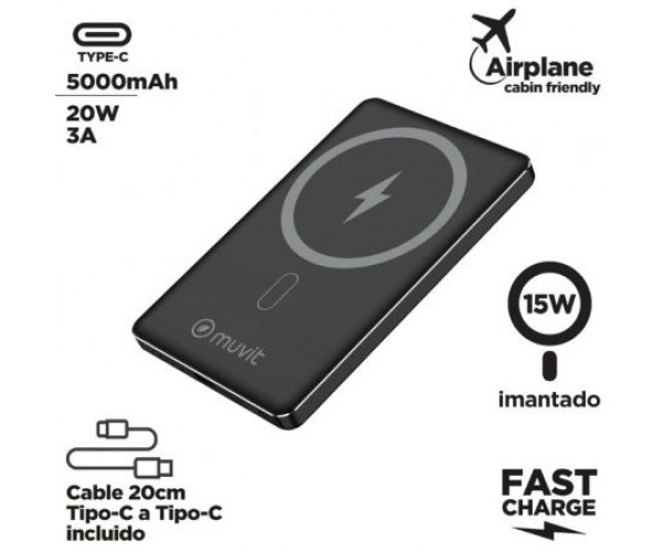Powerbank 5000mAh Muvit For Change MCCHP0009/ 20W/ Wireless/ Negra/ Incluye Cable USB Tipo-C