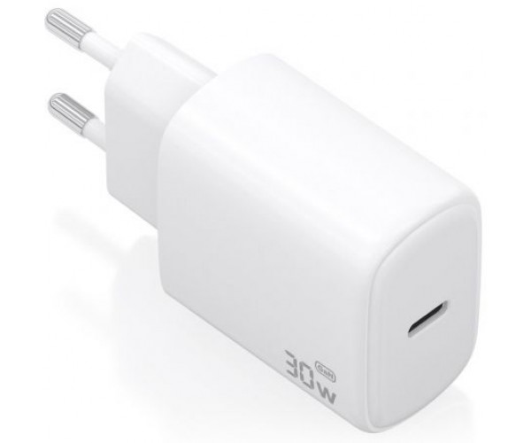 Cargador GaN USB-C de 30W diseñado para cargar portátiles, teléfonos móviles, cámaras y tablets, entre otros dispositivos. Presenta un diseño elegante, moderno y práctico.