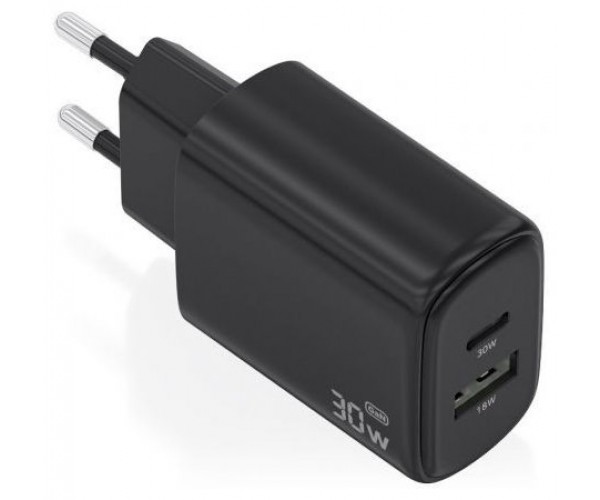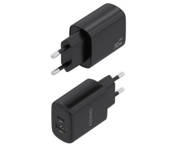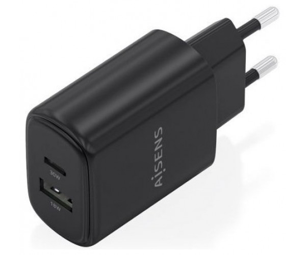 AISENS - CARGADOR GaN 30W, 1xUSB-C PD3.0 QC4.0, 1xUSB-A QC3.0, NEGRO