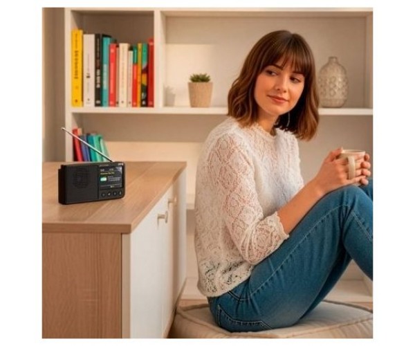 Radio digital DAB+ y FM con amplia pantalla TFT de 2,4” a color, con DAB+ y FM RDS (Radio Data System) para ver en ella la emisora, la hora, las funciones activas y más. 80 presintonías, sintonización fácil, batería recargable con hasta 7h de autonomía, función despertador y altavoz bluetooth de 2W.