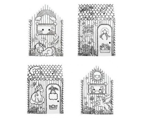 Casita de juegos realizada en resistente cartón ondulado con motivo de unicornio, lista para colorear, fácil montaje en dos piezas, puertas y ventanas que se abren e impresa con tintas al agua sobre cartón certificado FSC.