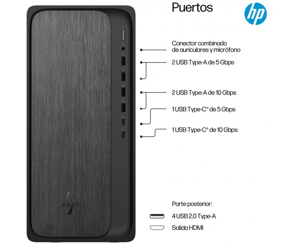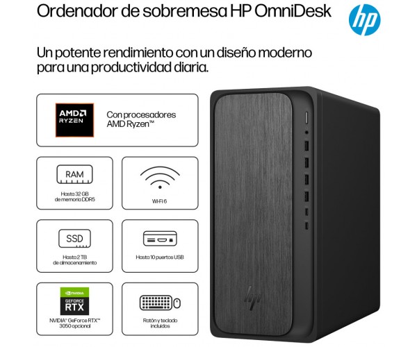 Obtén un rendimiento equilibrado y gráficos con gran capacidad de respuesta gracias al ordenador de sobremesa HP OmniDesk, equipado con procesadores AMD Ryzen™[1]. Las capacidades opcionales de IA admiten una multitarea fluida, mientras que la memoria DDR5 reduce los tiempos de carga. Mantén la productividad con los puertos más recientes, incluido USB-C[4], y gráficos opcionales para unas imágenes inmersivas.