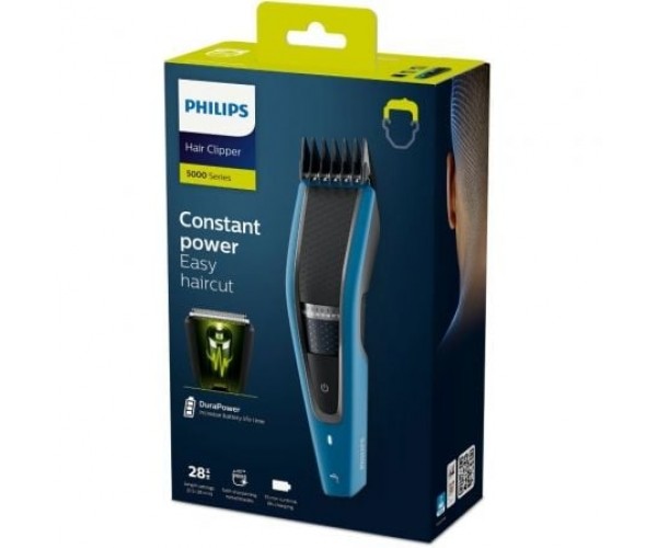 Consigue un corte de pelo uniforme gracias a la tecnología DualCut y Trim-n-Flow Pro. El nuevo diseño del peine-guía evita que el pelo de cualquier longitud se atasque, para que puedas terminar el peinado de una pasada. El innovador diseño del peine-guía permite que el cabello cortado quede alejado de las cuchillas mientras se está usando, lo que evita que incluso los cabellos de mayor longitud se atasquen en el peine-guía. Así podrás comenzar y terminar tu peinado sin interrupciones. Recorta cualquier tipo de pelo con la avanzada tecnología DualCut: una innovadora unidad de corte bilateral que corta el pelo el doble de rápido que las cuchillas unilaterales. Gira la rueda de ajuste de longitud de corte y bloquee la longitud que deseas. Los dos peines-guía ajustables cortan entre 3 mm y 28 mm, con una precisión de 1 mm entre cada longitud. Utiliza el peine-guía para la barba de 2 mm para cortar pelos cortos o para perfilar tu barba. Retira el peine-guía para un corte apurado de 0,5 mm. La potente batería del cortapelos proporciona hasta 75 minutos de uso sin cable después de 8 hora de carga y ofrece la máxima potencia y libertad. El cortapelos Series 5000 ha sido diseñado con facilidad de uso, comodidad de manejo y sencillez de funcionamiento. La textura especial y el mango permiten mover fácilmente el cortapelos y recortar por toda la cabeza. Ahorra tiempo y molestias gracias a las cuchillas autoafilables de larga duración que se mantienen tan afiladas como el primer día, incluso después de 5 años. El cortapelos es 100 % lavable para una limpieza rápida y sencilla debajo del grifo.