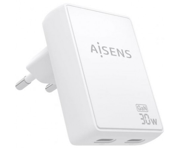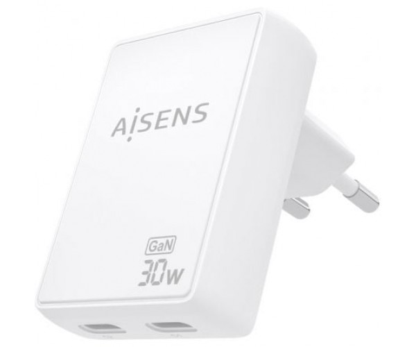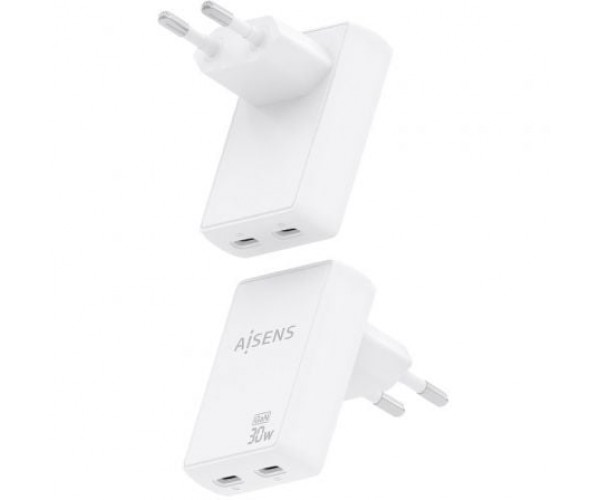 AISENS - CARGADOR DE PARED GaN ULTRA DELGADO 30W, 2xUSB-C PD3.0 QC4.0, BLANCO