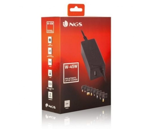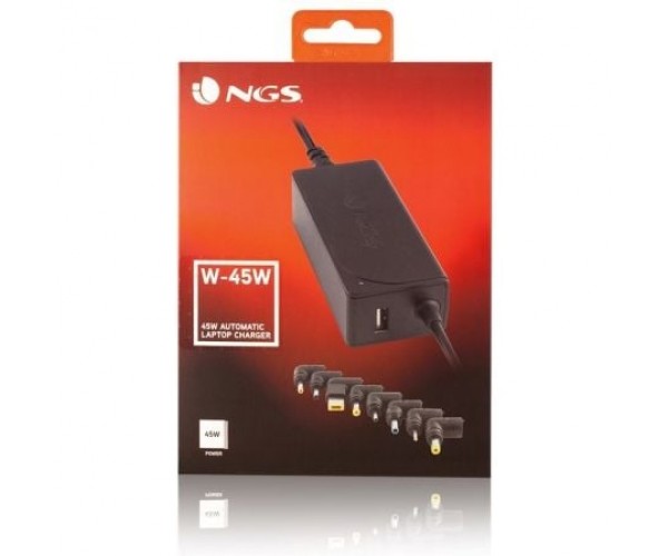 Cargador de Portátil NGS W-45W/ 45W/ Automático/ 8 Conectores/ Voltaje 19-20V/ 1 USB