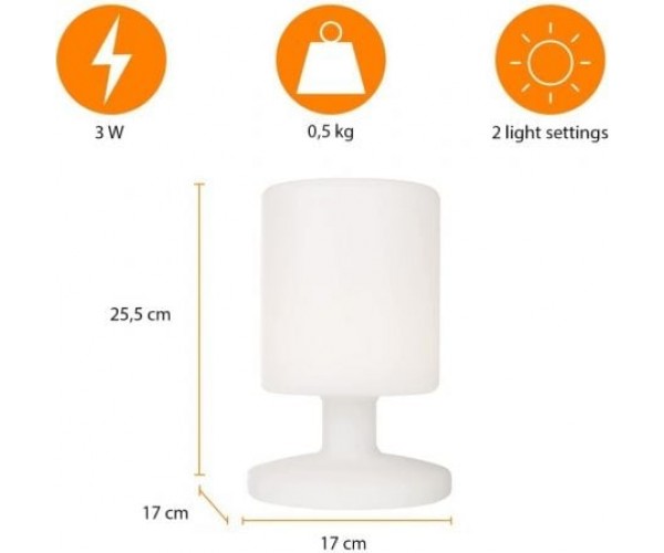 La luz LED integrada es de 3 W y produce 160 lúmenes cuando se utiliza con la mayor intensidad de luz. Esto se puede comparar con la salida de luz de una bombilla incandescente con aproximadamente 11 W. Además, la luz tiene una temperatura de color de 3000 K, lo que proporciona una cálida luz blanca. La luz tiene una etiqueta energética B, lo que hace que la luz sea de bajo consumo. Además, la luz de mesa se puede usar en el exterior gracias al nivel de protección IP44.Contenido de la caja