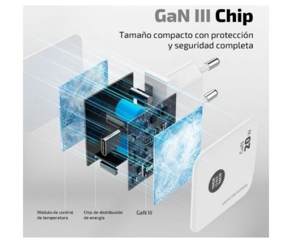 Cargador ultrarrápido con tecnología GaN Power Delivery 3.0 (PD) 20W, color blanco. Carga hasta un 400% más rápido que un cargador estándar de 5W. Compatible con dispositivos anteriores. Conector tipo USB-C de 3A. Este cargador permite cargar dispositivos como tabletas, móviles, consolas, baterías, auriculares, etc.