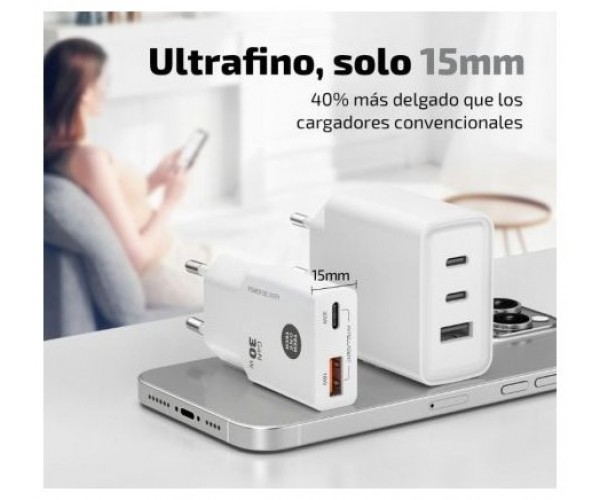 Cargador ultrarrápido GaN Power Delivery 3.0 (PD) 30W, color blanco. Carga hasta un 400% más rápido que un cargador estándar de 5W. Compatible con dispositivos anteriores. 2 Conectores: tipo USB-C de 3A + Conector USB-A. Este cargador permite cargar dispositivos como tabletas, móviles, consolas, baterías, auriculares, etc.