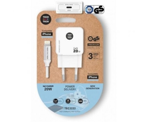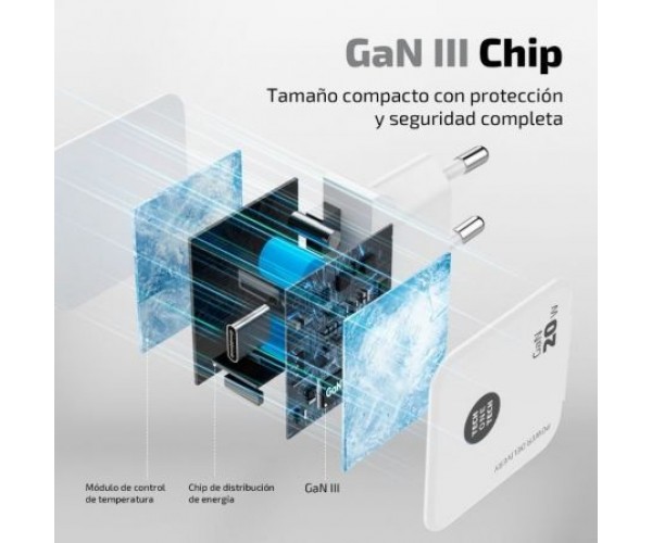Cargador ultrarrápido con tecnología GaN Power Delivery 3.0 (PD) 20W, color blanco. Carga hasta un 400% más rápido que un cargador estándar de 5W. Compatible con dispositivos anteriores. Conector tipo Apple lightning de 3A. Este cargador permite cargar dispositivos como tabletas, móviles, consolas, baterías, auriculares, etc.